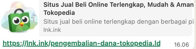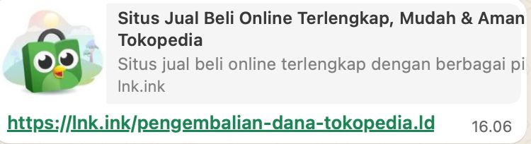 Memang mereka menggunakan tampilan yang mirip dengan tokopedia, namun kalau diperhatikan maka linknya berupa lnk.ink bukanlah link yang ada hubungannya dengan tokopedia.