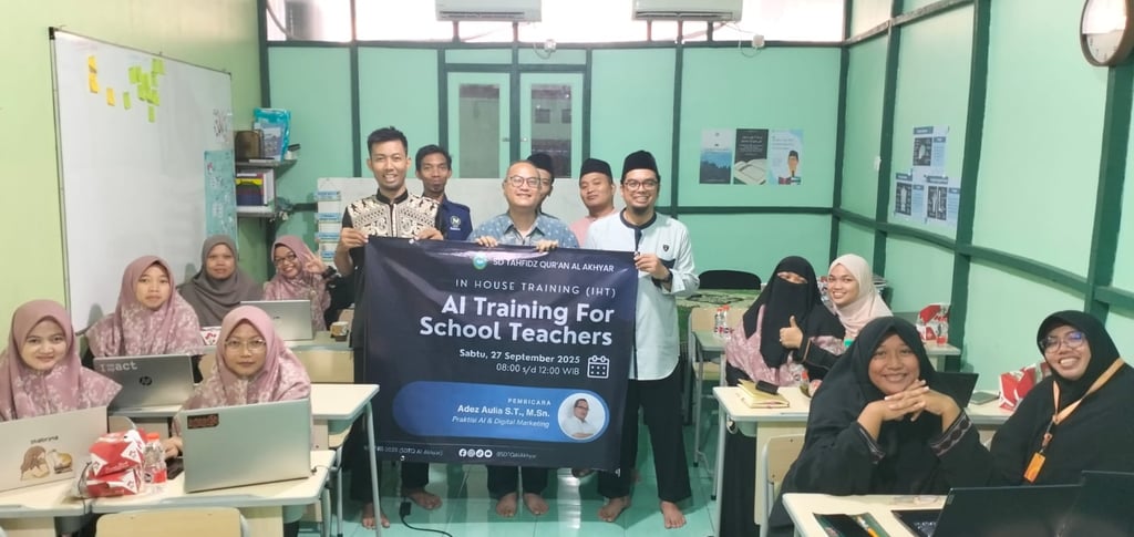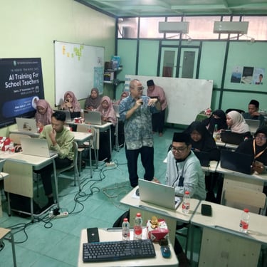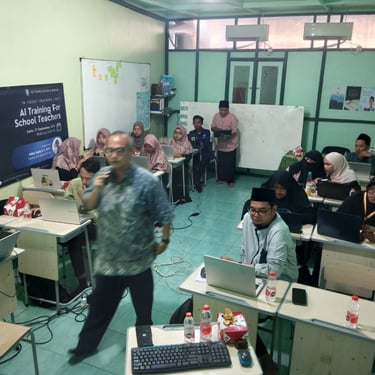 Semua masalah di atas itu bisa diatas oleh guru sendiri. Untuk menjawab 2 tantangan di atas, sebagai praktisi AI saya diminta untuk membantu pelatihan AI bagi para guru SD yang dilakukan oleh SD Tahfidz Al Quran Al Akhyar di Bekasi. Materi pelatihan dibuat agar bisa menjawab 2 masalah di atas, yaitu pelajaran yang langsung di aplikasi di kelas. Dan juga bagaimana menyiapkan materi ajar yang menyenangkan.