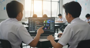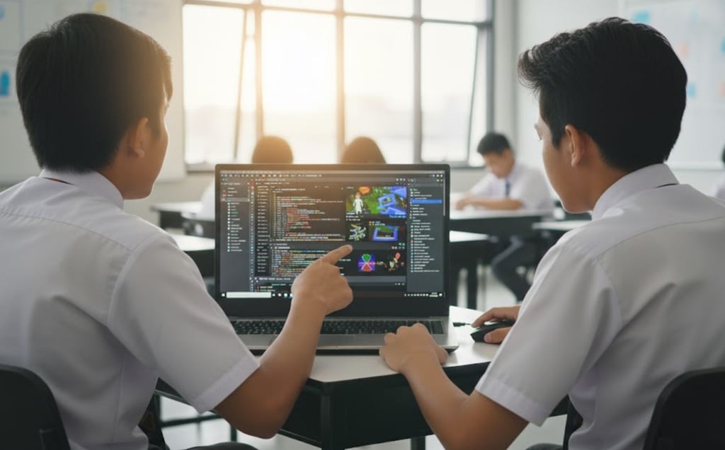 Dua orang siswa SMA yang sedang mendiskusikan hasil game vibe coding yang sedang mereka kerjakan